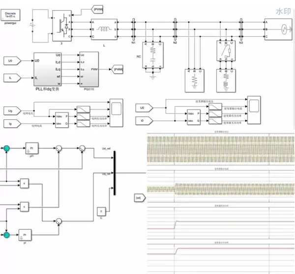 将PQ控制模块与LC滤波器模型整合至完整的并网逆变器仿真系统中,可在Matlab/Simulink环境下构建闭环控制系统。经过合理配置控制参数与系统结构,仿真结果显示:有功与无功功率能够迅速跟踪设定值,动态响应良好,稳态误差小;同时,并网电流经LC滤波后波形平滑,总谐波畸变率(THD)显著降低,满足并网电能质量标准。