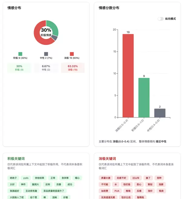 支持对输入文本进行积极、中性、消极三类情感划分,并附带置信度评分,便于快速掌握整体情绪分布态势。