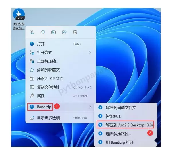 1. 将下载完成的压缩包右键选择【解压到 ArcGIS Desktop 10.8\】目录下,请确保目标磁盘有足够的可用空间。