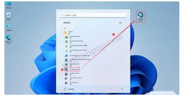18. 回到桌面,打开【开始菜单】→【所有应用】,找到【ArcMap 10.8.1】图标,将其拖拽至桌面,创建快捷方式以便快速访问。