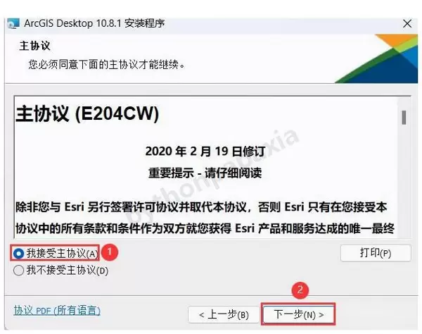 7. 阅读许可协议内容,确认无误后勾选【我接受】,然后点击【下一步】。