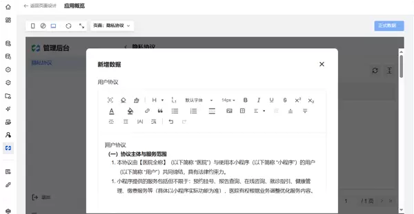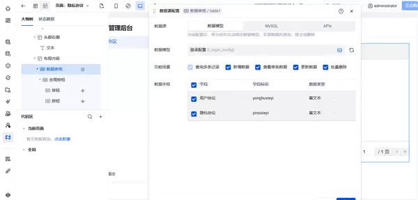完成数据表结构后,接下来需要构建一个后台管理系统,便于管理员维护协议内容。我们使用微搭低代码平台进行开发。