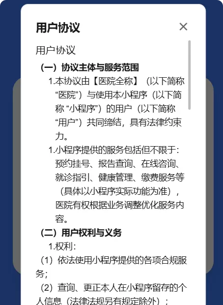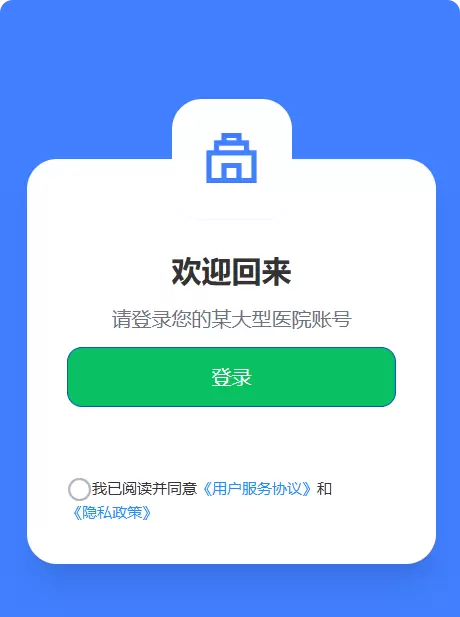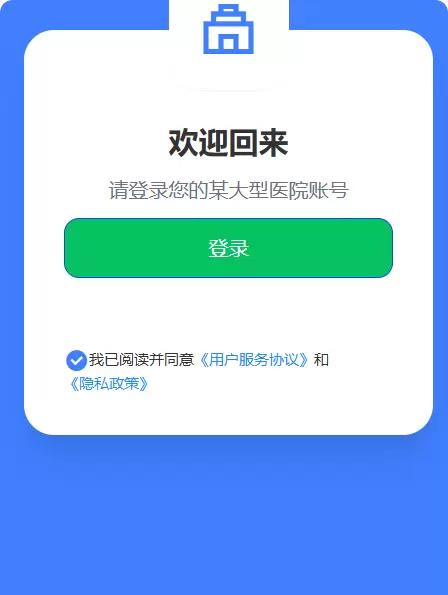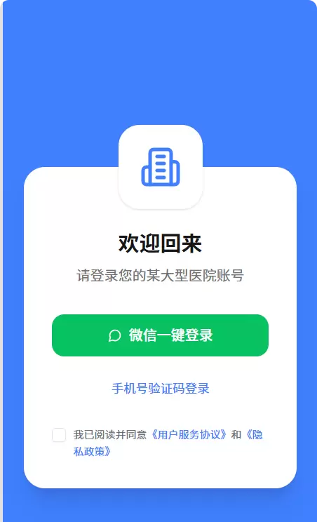 完成上述所有步骤后,登录页将呈现出清晰的层级结构与良好的交互体验:蓝色背景衬托出中央白色卡片式登录框,顶部配有医院形象图标,下方有序展示协议内容入口,整体风格简洁专业,符合医疗类应用的视觉定位。