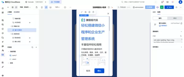 随后插入一个弹窗组件,并在其内部加入富文本展示组件,用以呈现协议详情。