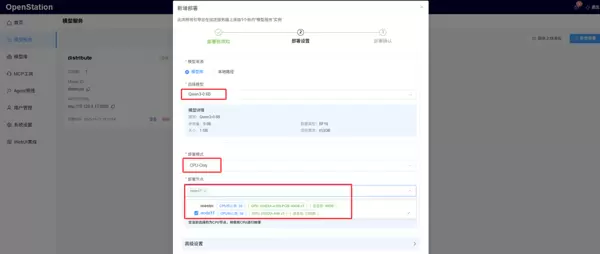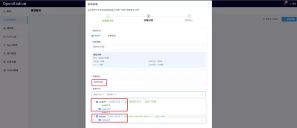 - Distributed(分布式部署):需选择两个及以上计算节点,且每个节点分配相同数量的加速卡;平台自动启用张量并行与流水线并行策略,推荐使用 vLLM (GPU) 引擎,适用于大参数模型的跨节点部署;