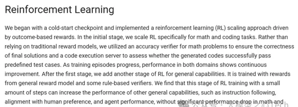 - RL Scaling 阶段:利用 math、code 等可验证任务进行大规模强化学习扩展。此阶段无需关注输出是否可读或是否符合人类偏好,甚至允许中间产物不可理解,目标是极致提升模型的推理与自我修正能力。