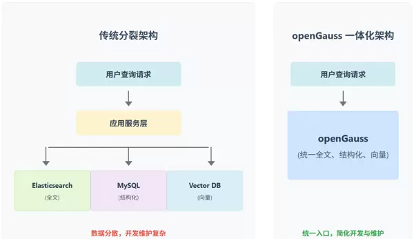 | 一体化混合查询 | 1500ms+ | < 200ms | 数量级提升:传统架构依赖多次跨系统调用和应用层 Join,而 openGauss 在数据库内核完成全部操作,避免了网络开销与中间聚合成本 |