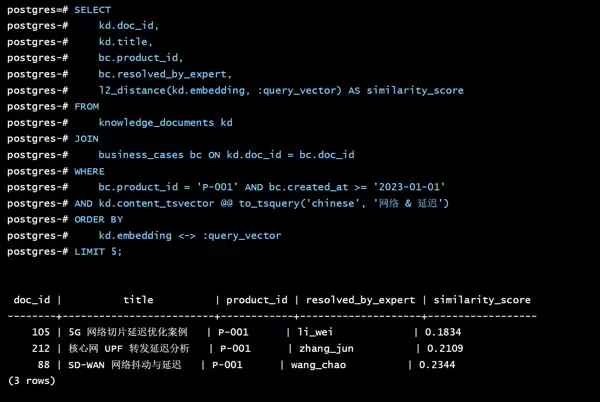 - 多模态过滤能力:WHERE 子句整合了结构化字段(如 product_id、created_at)与全文检索(通过 @@ 操作符)的联合筛选机制,实现精准数据定位。