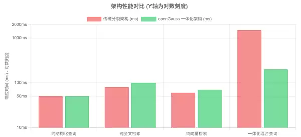 相较于传统多系统拼接架构,基于 openGauss 的一体化方案在典型混合查询场景下展现出显著优势: