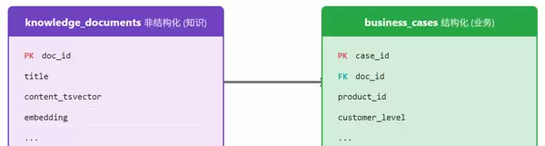 doc_id 外键,实现了结构化业务信息与非结构化知识内容之间的强关联,形成完整的知识-业务闭环。