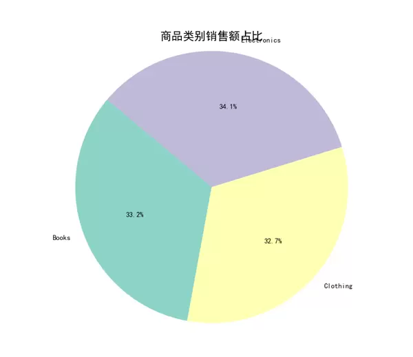 通过绘制饼状图呈现不同商品类别在总销售额中所占比例,突出显示主导品类的贡献度。