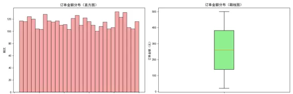 采用组合图表方式展示订单金额的整体分布特征:左侧为直方图,反映频次分布;右侧为箱线图,揭示数据离散程度及异常值情况。
