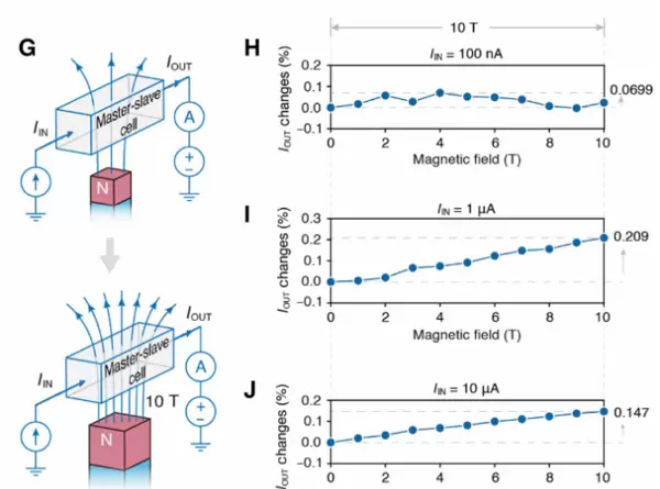 除温度外,磁场干扰也是衡量器件鲁棒性的重要指标。研究团队在0–10 T的强磁场范围内对该计算单元进行了测试。通常情况下,强磁场会改变载流子运动轨迹,影响常规模拟器件的传输性能。然而,在该基于几何比的架构中,输出电流在100 nA、1 μA、10 μA三种输入条件下的波动均小于0.21%。