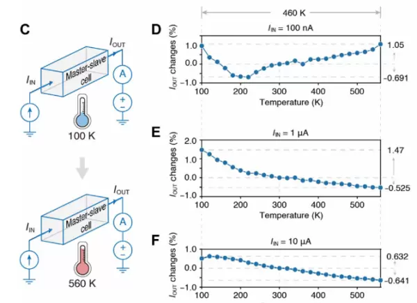 为深入分析温度对单元级电路的影响,研究人员在100–560 K宽温区内测试了单个主从计算单元的表现。在三种典型输入电流(100 nA、1 μA、10 μA)下,输出电流相对于300 K基准的偏差始终控制在1.47%以内。这说明尽管载流子迁移率、阈值电压等电学参数随温度变化显著,但由器件几何尺寸决定的权重比例保持稳定,从而保障了整体计算精度不受环境干扰。