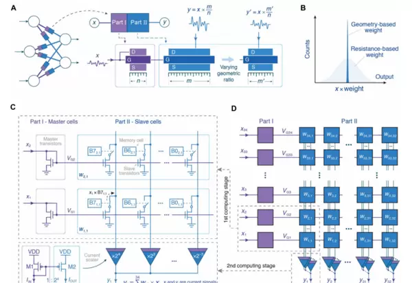 其核心原理如图1A所示:计算过程由两个晶体管沟道宽度之比(m/n)精确决定。由于几何结构具有制造后不可变的特性,该方式确保了计算的高度可重复与精确输出。概念对比见图1B,清晰展示了新旧方法在稳定性上的差异。