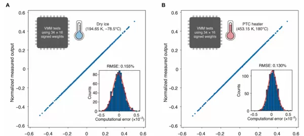 测试结果表明,在-78.5℃低温条件下,芯片的VMM误差仅为0.155%;而在180℃高温环境下,RMSE也仅达0.130%,运算结果与室温状态几乎一致,展现出卓越的热稳定性。
