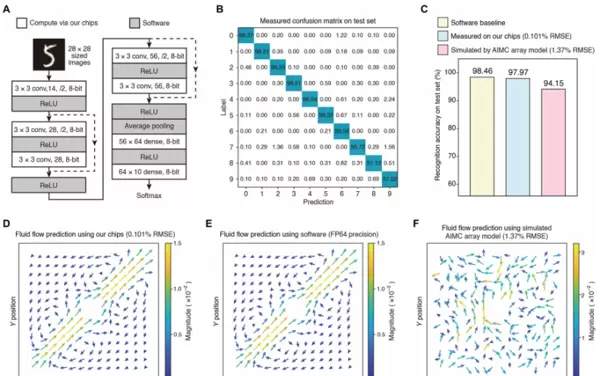 得益于极高的计算精度,该模拟存算一体芯片展现出在复杂任务中实际应用的巨大潜力。研究团队首先将其应用于人工智能领域的经典场景——MNIST手写数字识别任务。如图3A所示,实验搭建了一个包含卷积层和全连接层的神经网络模型,所有矩阵乘法运算均由该模拟芯片完成。测试结果显示,芯片在标准测试集上实现了97.97%的识别准确率。