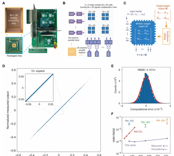 - 实现超高硬件精度:在芯片层面达成0.101%均方根误差的计算精度,达到当前国际报道中模拟计算芯片的最高水平。