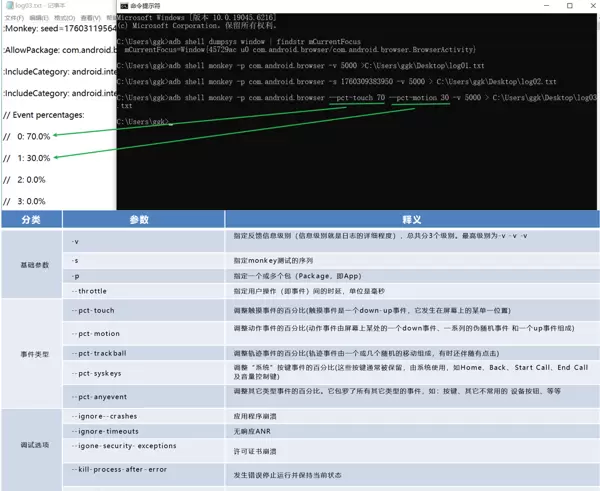 adb shell monkey -p com.android.browser --pct-touch 70 --pct-motion 30 -v 5000 > C:\Users\ggk\Desktop\log03.txt