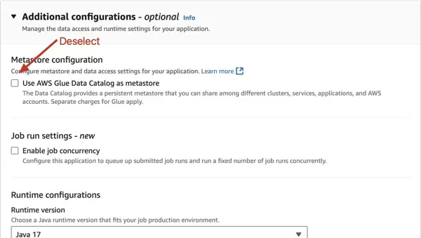 在创建 Sagemaker Unified Studio 时,默认会启用 Glue Catalog 作为元数据目录。若希望在 Notebook 中使用 Databricks 的 Unified Catalog,需覆盖原有的 Glue Catalog 配置。请特别注意以下 catalog 相关设置: