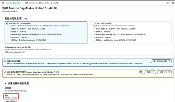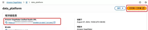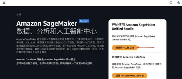 - 进入 Amazon SageMaker 控制台,点击“创建统一工作室域”按钮以启动域的创建流程。