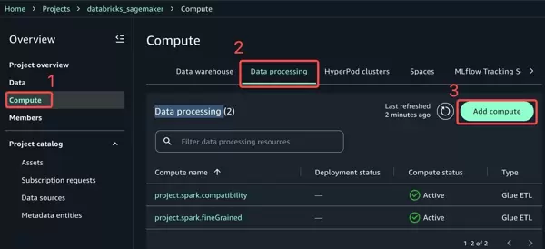 - 下一步是添加 EMR Serverless 计算资源。进入项目后,在左侧导航栏选择 Compute,进入后点击 Data processing,再点击 Add compute 开始添加计算引擎。