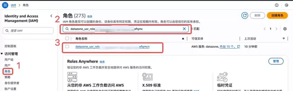 datazone_user字段起开始复制完整 ARN 信息。 - 切换至 IAM 服务控制台,点击左侧的“角色”列表,搜索并定位到上一步复制的项目角色,点击进入角色详情页。
