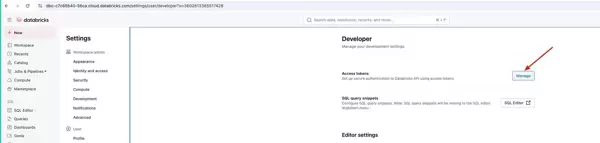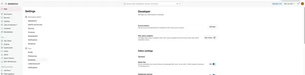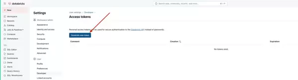 接着,配置 Databricks 用户的 Personal Access Token。登录后点击用户个人设置中的 Settings 选项进入配置页面。