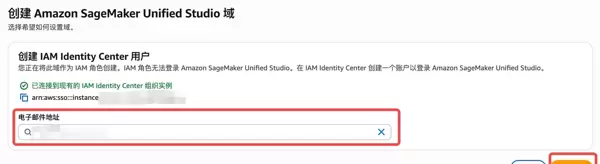 - Unified Studio 域默认启用 IAM 用户身份验证机制。在此步骤中,输入已在 IAM Identity Center 中注册的用户邮箱地址。