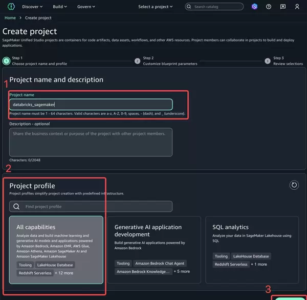 - 设置项目名称,并选择适用的项目配置文件。项目配置文件相当于创建项目的模板集合,决定了项目成员在处理 Amazon SageMaker 目录数据时可使用的工具和服务范围。本示例中选择“所有功能”选项,然后点击继续。