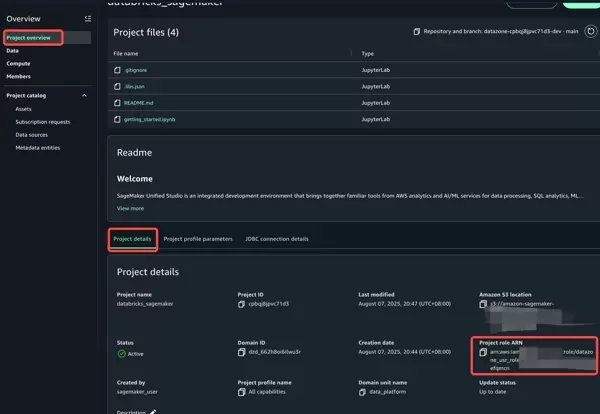 - 在项目界面左侧的概览菜单中选择 Project overview,在 Project details 区域找到 Project role ARN,从