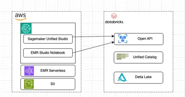 借助 SageMaker Unified Studio 中托管的 JupyterLab 环境,并结合 EMR Serverless 提供的强大计算资源,用户可直接读取 Databricks Unity Catalog 内受控管理的数据资产。此架构避免了传统 ETL 流程中的数据复制和转换环节,使数据科学家能够实时获取最新业务数据,显著提升模型开发效率与响应速度。