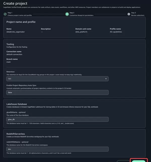 - 可根据实际需求调整日志保留周期等参数。由于当前场景已禁用 Glue Catalog,因此 Lakehouse Database 中的 Glue 数据库名称无需修改,保持默认即可。点击继续后跳转至下一页,再点击“创建项目”。创建完成后,系统将自动跳转至项目主页。