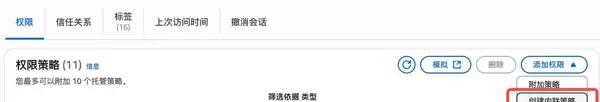 - 为该角色创建内联策略。请使用如下策略内容,并将示例中的存储桶名