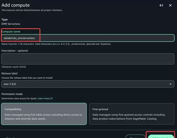 - 在计算类型中选择 EMR Serverless,点击 Next。随后修改 Compute name 名称,其余选项保持默认,最后点击 Add compute 完成添加。