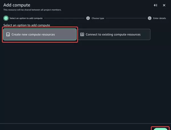 - 您可以选择连接现有计算资源;若尚未创建,则选择 Create new compute resources,然后点击 Next。