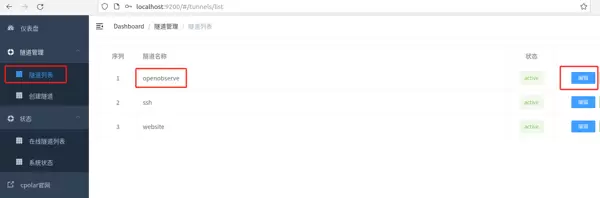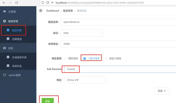 复制保留成功的子域名(如 myoo1),返回 cpolar Web UI 管理界面。进入“隧道管理” → “隧道列表”,找到之前创建的 OpenObserve 隧道,点击右侧“编辑”按钮进行修改。