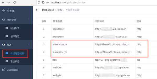 创建完成后,返回“在线隧道列表”页面,可以看到系统已为该隧道生成了两个公网访问地址。此后,无论身处何地,都可以通过其他设备(如电脑、手机或平板)在浏览器中输入任一公网地址进行访问。