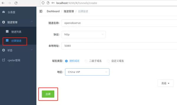 登录 cpolar Web UI 管理界面后,点击左侧仪表盘中的“隧道管理”选项,选择“创建隧道”。 配置参数如下: - 隧道名称:可自定义命名,本例中设置为 OpenObserve,请确保不与现有隧道重名 - 协议类型:http - 本地地址:5080 - 域名类型:随机域名 - 地区:China VIP