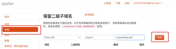 首先登录 cpolar 官网,在左侧菜单中选择“预留”,然后点击“保留二级子域名”。在表单中填写相关信息: - 地区:选择 China VIP - 子域名名称:自定义输入,例如 myoo1(可根据个人喜好设定) 提交后,系统将保留该子域名,复制生成的完整二级子域名备用。