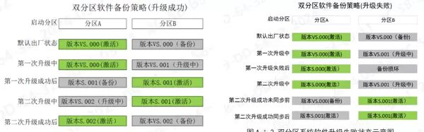 相较于传统固件升级方式,采用双分区设计可在ECU升级失败或其他异常情况下自动恢复到先前正常运行的版本,确保设备持续可用。以下图示展示了某项目中OTA升级成功与失败两种状态下的运行情况: