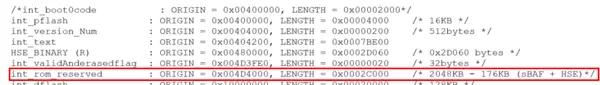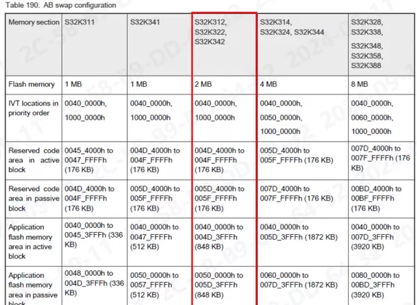 以S32K312型号为例,其Flash总容量为2MB。开启AB Swap后,每个激活/备份分区可用空间为848KB,保留代码区(Reserved Code)占用176KB。因此,在编写ld链接脚本时,应特别注意避免将用户程序映射至该保留区域,防止冲突。