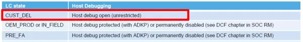 安全Debug功能的启用状态取决于芯片的Lifecycle(LC)所处阶段,其权限配置遵循以下规则:LC状态决定Debug功能是完全开放还是受到保护。该演进过程为单向不可逆流程,出厂时芯片默认处于CUST_DEL状态。一旦进入后续阶段,Debug功能将被永久锁定,必须通过密码认证才能启用,且无法恢复至初始开放状态。