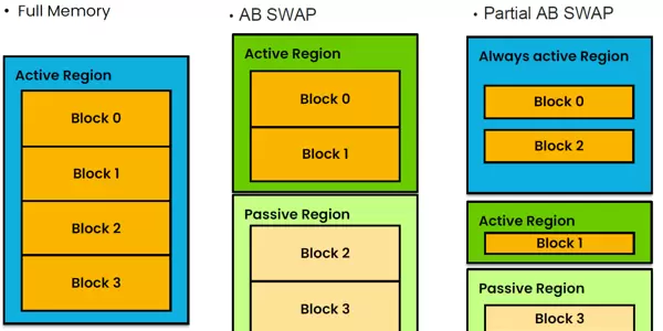 S32K3系列芯片提供三种内存分配模式:Full Memory、AB Swap以及Partial AB Swap。不同模式下的内存布局如下图所示: