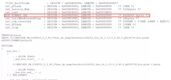 参照提供的Demo工程,在链接脚本(ld文件)中添加名为HSE BINARY的内存段,其起始地址需与启动代码中定义的HSE_FW_ADDR保持一致。修改示意如下:
