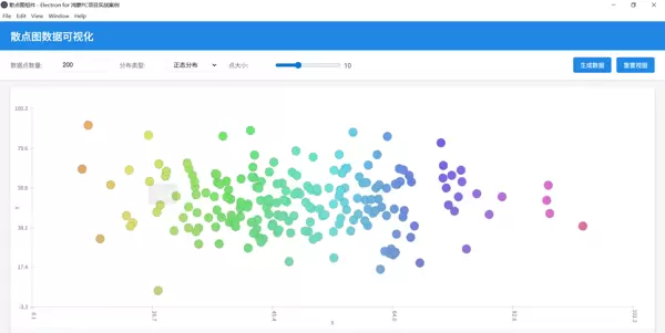 本项目开发了一个基于 Electron 框架的二维散点图可视化工具,用于呈现和分析数据点的空间分布特征与相互关系。整个应用使用纯 JavaScript 构建,通过 Canvas API 实现图形绘制,具备高效渲染能力。支持多种数据生成模式,包括正态分布、均匀分布及完全随机分布,并集成了丰富的交互功能,如鼠标拖拽平移、滚轮缩放、悬停信息提示以及可调节的数据点尺寸等。在架构设计上,遵循 Electron 的主进程与渲染进程分离机制,利用 contextBridge 安全地暴露必要接口,保障了系统的安全性与运行效率。