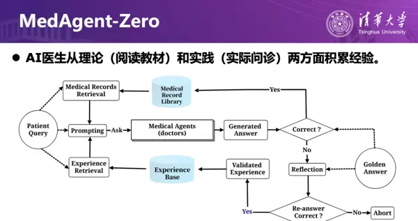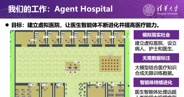 团队在虚拟空间中搭建了一座流程完整的数字医院:患者经历发病、分诊、挂号、问诊、检查直至康复的全过程,形成闭环诊疗流;医院涵盖二十多个科室、上千种疾病类型,既包含设定个性特征的 AI 患者,也集成了依据各类医学指南训练而成的多样化 AI 医生。虚拟时间被大幅加速,使得 AI 医生能在现实一到两天内完成相当于“虚拟两年”的临床实践,接诊上万名患者,并在成功与失败中不断积累经验、实现自我演化。