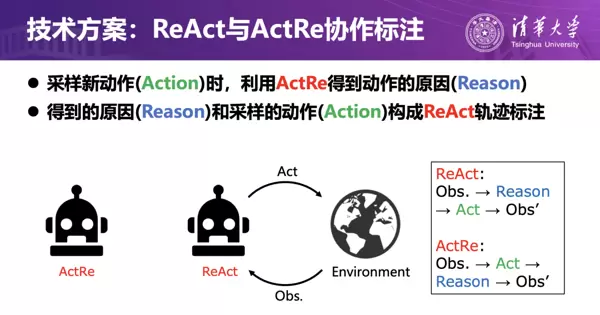 为此,团队在ReAct算法基础上提出了ActRe框架,使智能体在执行任务过程中能够自动生成可用于训练的数据。虽然传统的ReAct能在推理阶段输出“思考—行动”链路,但其动作(Action)缺乏系统性的合理性标注,难以直接作为训练样本使用。而ActRe引入了“原因生成”机制,即在每次采样新动作时,由模型同步生成该动作背后的“理由”(Reason),从而将“观察—思考—动作”完整打包为一条结构化的、可学习的交互轨迹。
