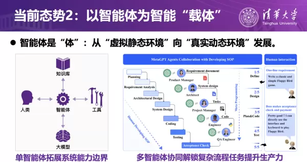 刘洋教授首先回顾了自2022年底ChatGPT发布以来大模型技术的飞速跃迁——过去需数十年积累的能力迭代,如今往往在数月内即可完成。这一变革催生出两大清晰趋势:大模型成为智能系统的“大脑中枢”,而智能体则成为赋能现实世界的“行动单元”。