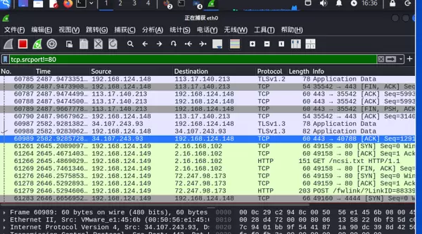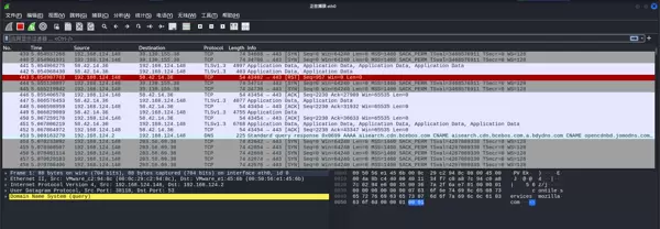 案例4:应用过滤条件 “tcp.srcport!=80”,排除基于 HTTP 默认端口 80 的流量,突出显示其他端口的传输数据。例如可看到 443 端口(HTTPS)的 TLSv1.2/1.3 加密报文、5355 端口(LLMNR)的 UDP 查询包等,适用于排查非 Web 类服务的网络异常。